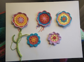 So I got my thinking cap on and rooted out an old canvas and started hooking up some flowers to stick on it, hoping I would be able to get a similar effect to the full hanging Happy Flower decoration.